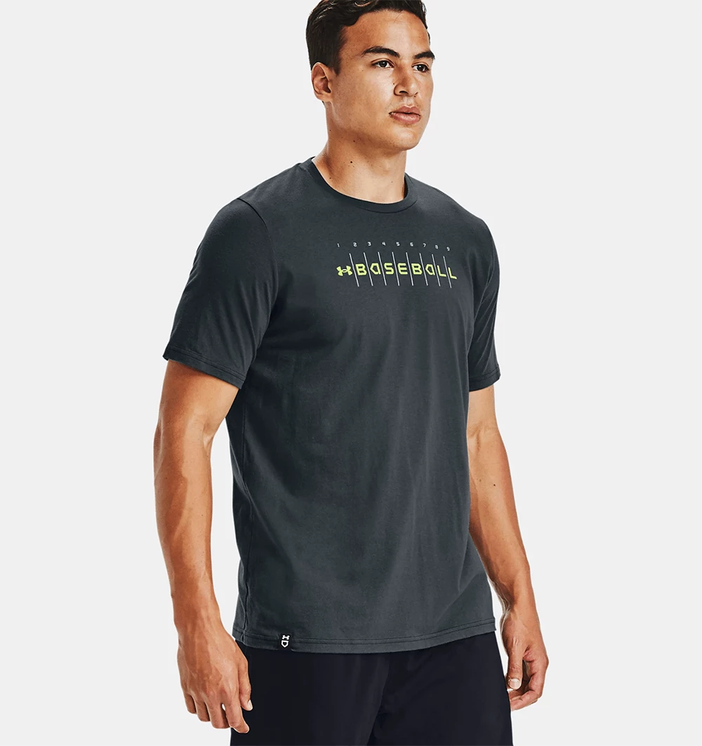 Head to batting practice wearing the Under Armour Men’s Wordmark Baseball T-shirt. Made of a super-soft cotton blend for lasting comfort, this T-shirt sports a branded baseball graphic across the chest that lets everyone know you came to play.